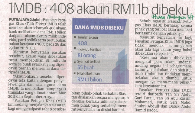 Utusan Malaysia - 1MDB : 408 Akaun RM1.1b Dibeku |
