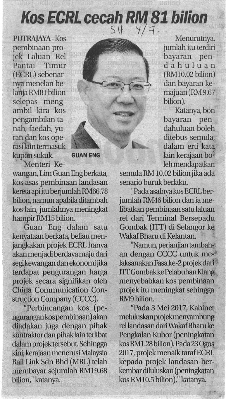 Sinar Harian - Kos ECRL Cecah RM81 Bilion |
