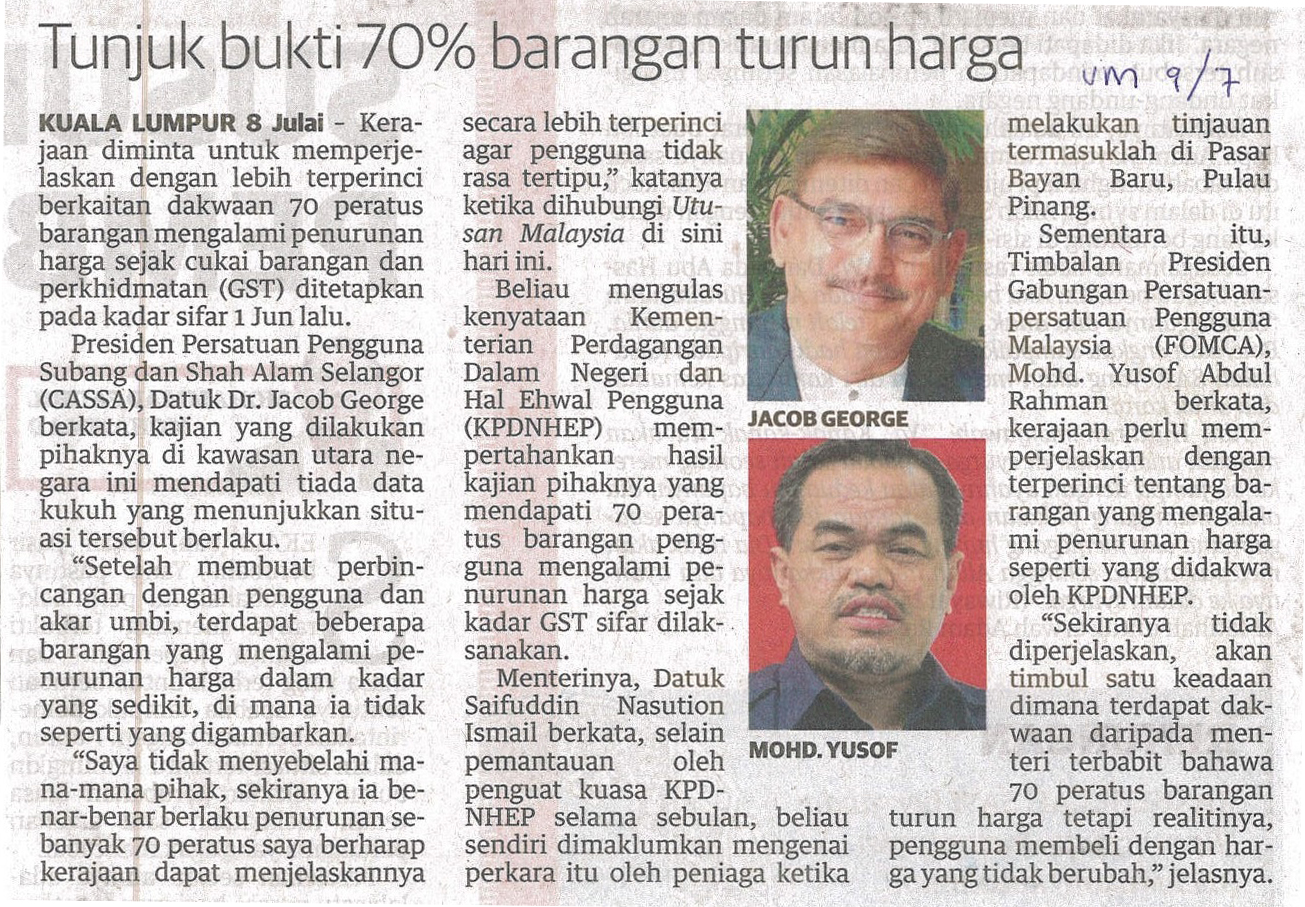 Utusan Malaysia - Tunjuk Bukti 70% Barangan Turun Harga |