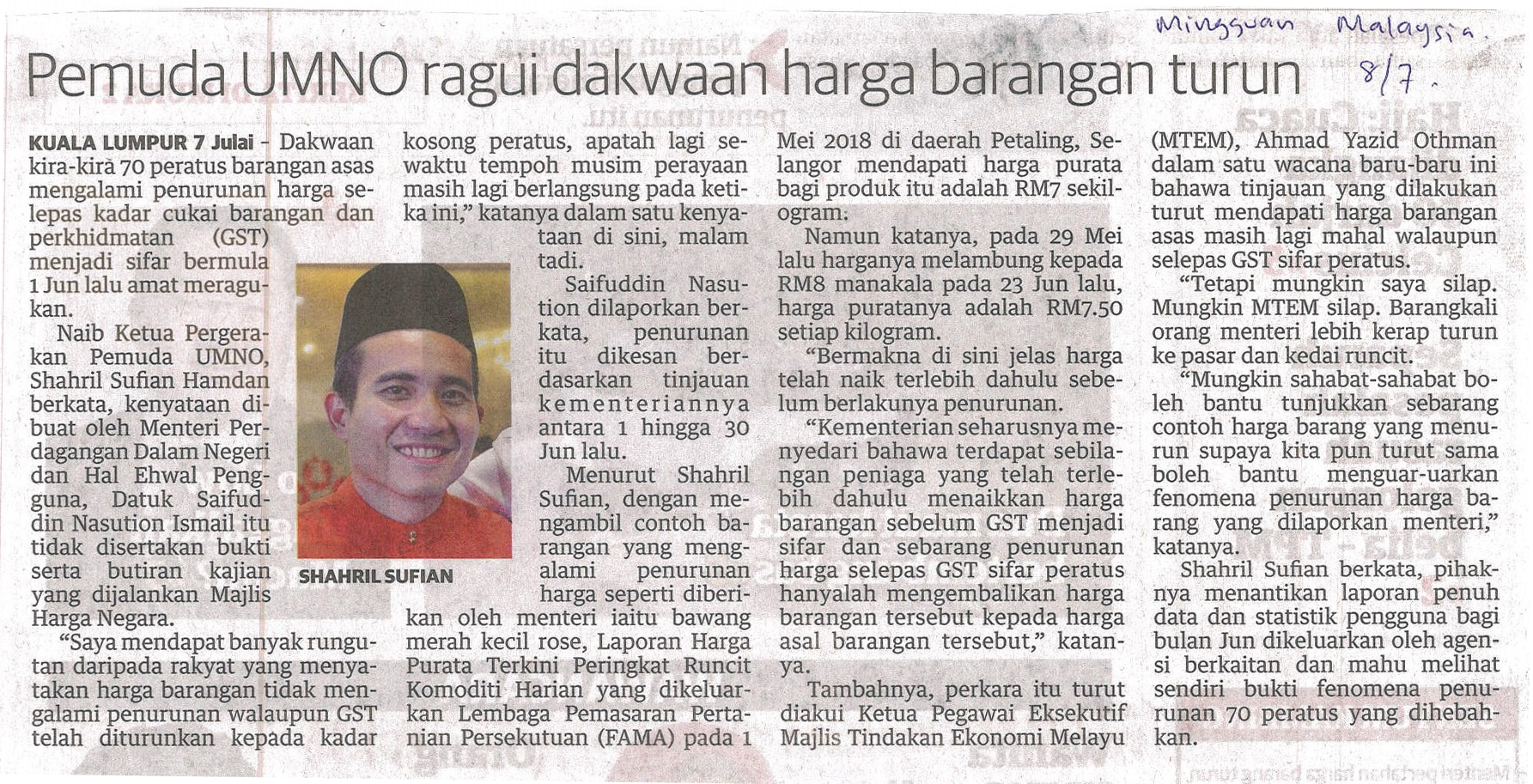 Mingguan Malaysia - Pemuda UMNO Ragui Dakwaan Harga Barangan Turun |