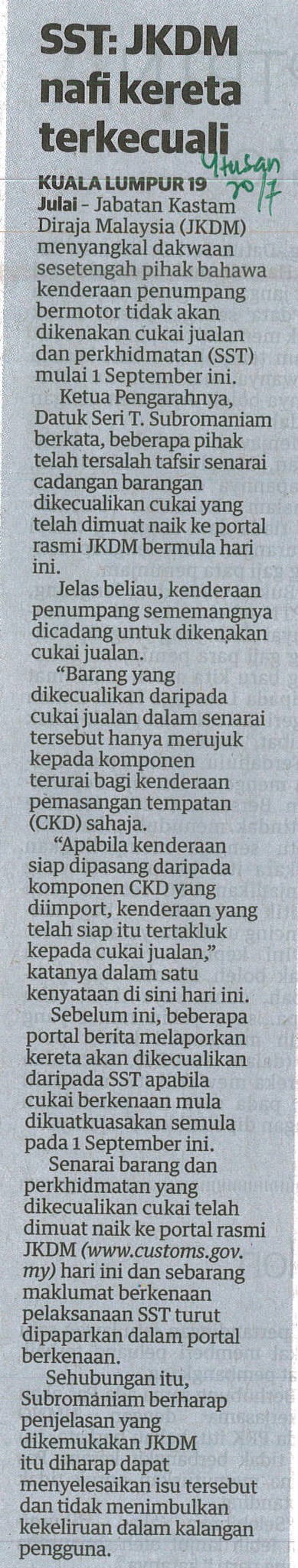 Utusan Malaysia - SST: JKDM Nafi Kereta Terkecuali