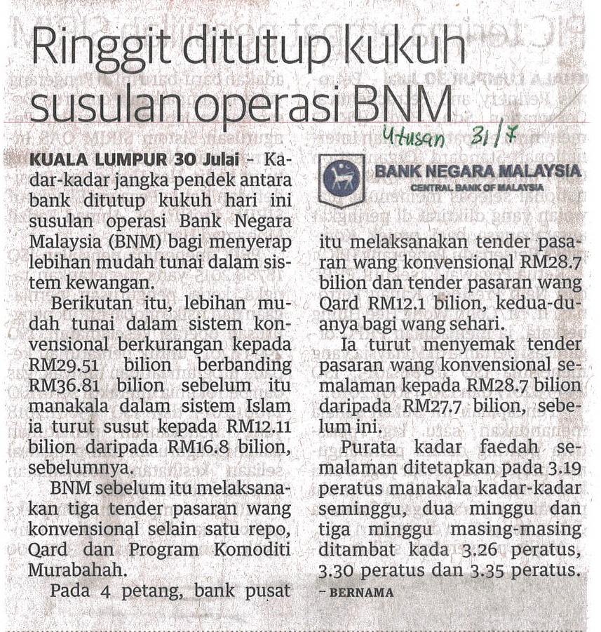 Utusan Malaysia - Ringgit Ditutup Kukuh Susulan Operasi BNM
