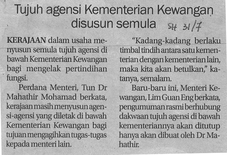 Sinar Harian - Tujuh Agensi Kementerian Kewangan Disusun Semula