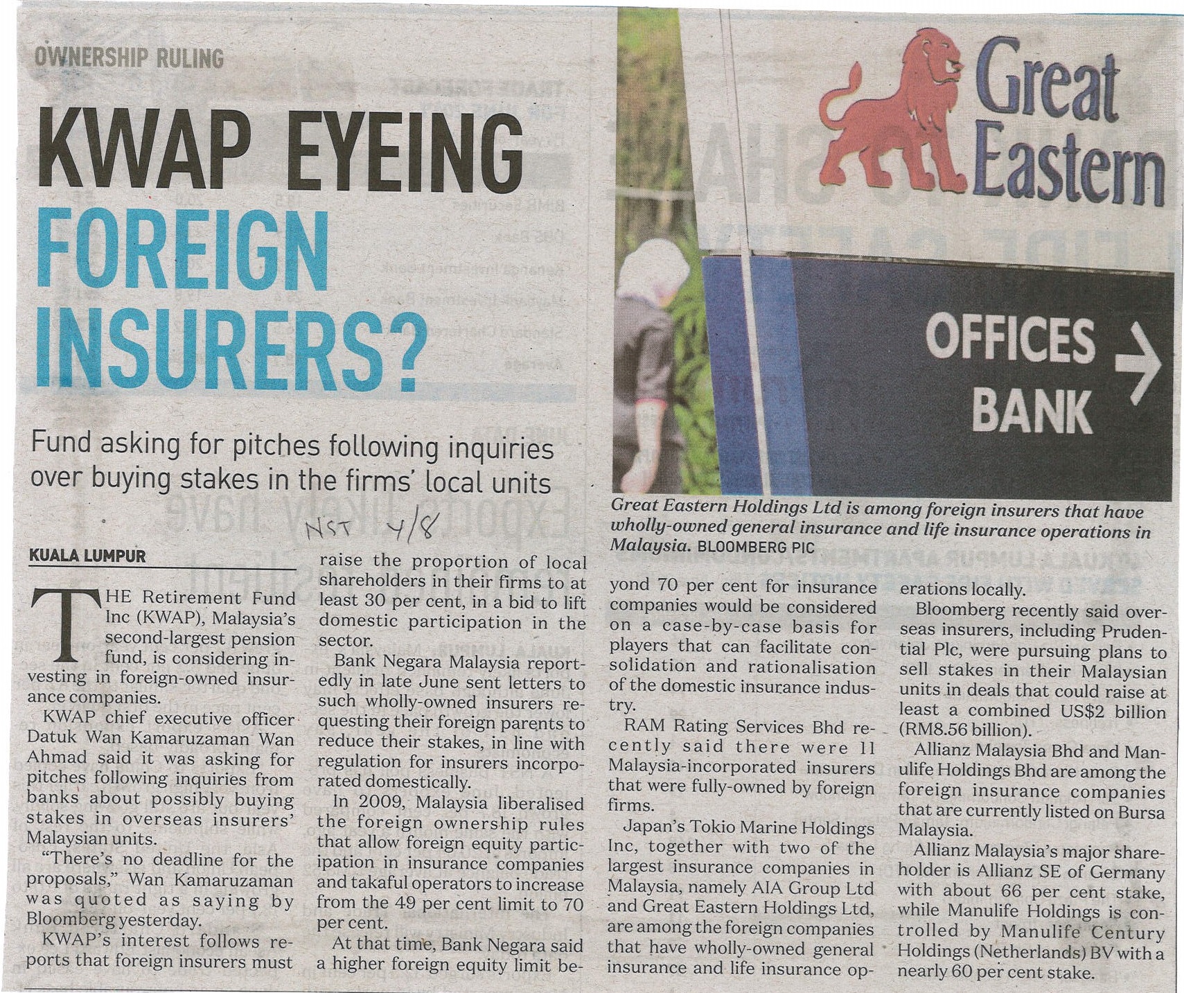 New Straits Times - KWAP Eyeing Foreign Insurers? |