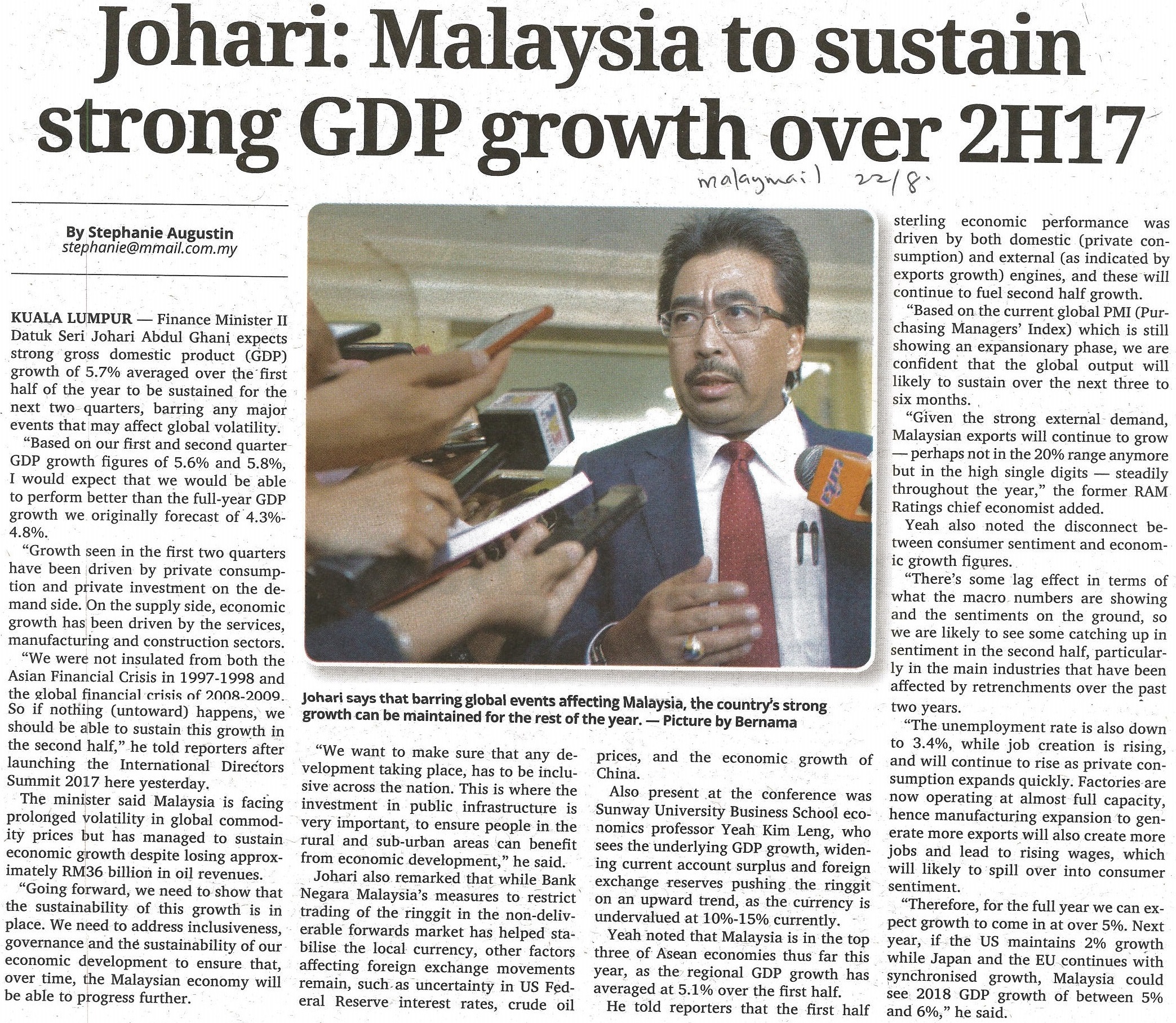 Malay Mail - Johari : Malaysia To Sustain Strong GDP Growth Over 2H17 |