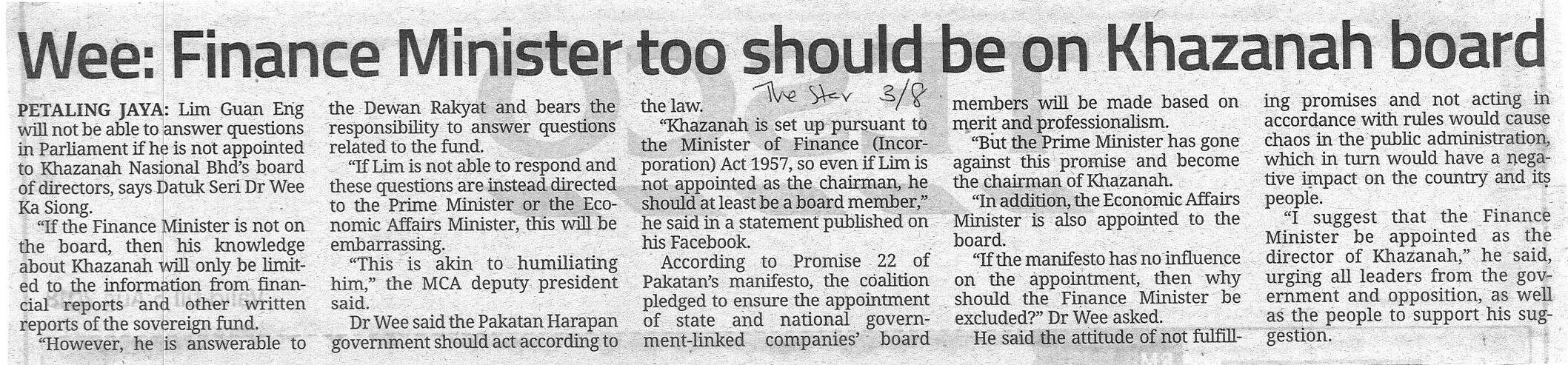 The Star- Wee: Finance Minister Too Should Be On Khazanah Board |