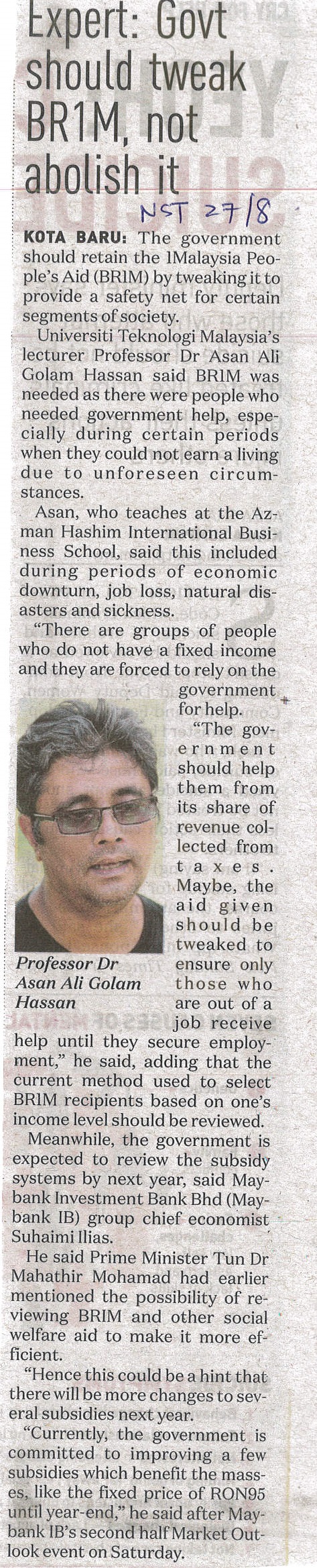 New Straits Times - Expert: Govt Should Tweak BR1M, Not Abolish It