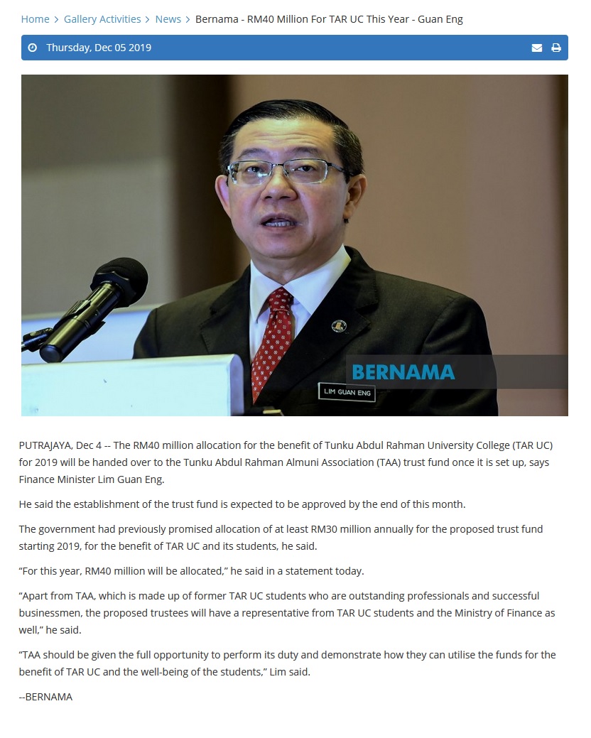 RM40 Million For TAR UC This Year - Guan Eng |