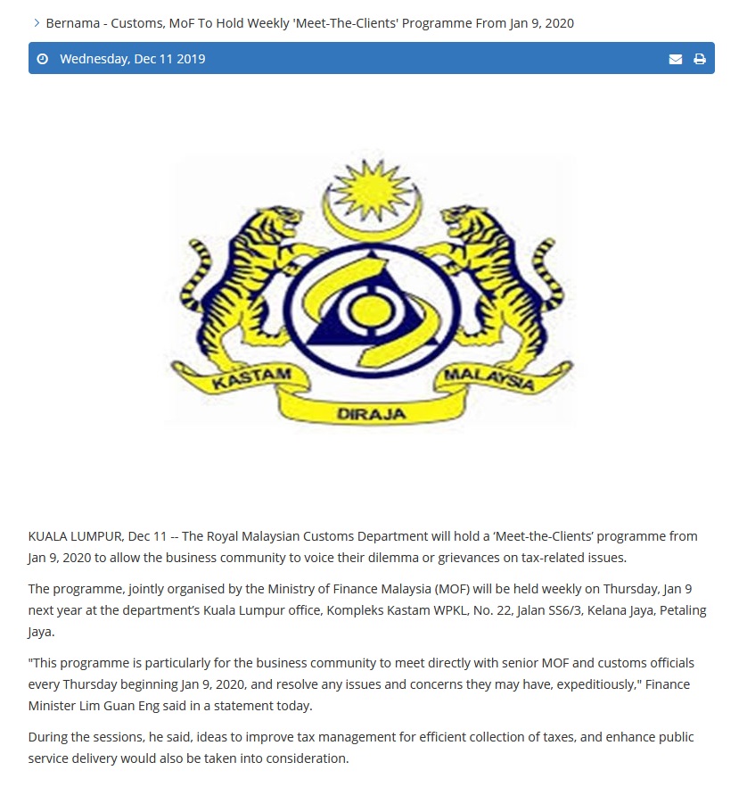 Bernama - Customs, MoF To Hold Weekly 'Meet-The-Clients' Programme From Jan 9, 2020 |