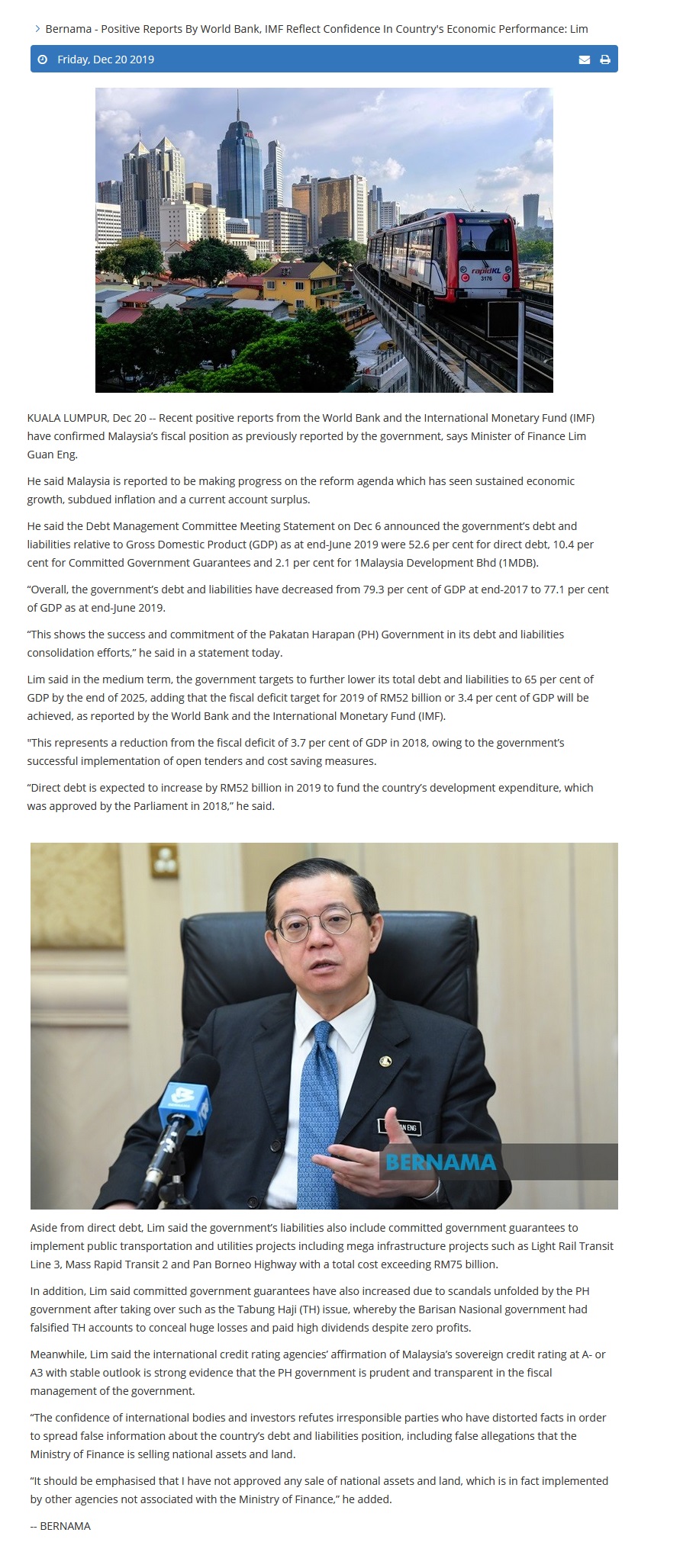 Bernama - Positive Reports By World Bank, IMF Reflect Confidence In Country's Economic Performance: Lim |
