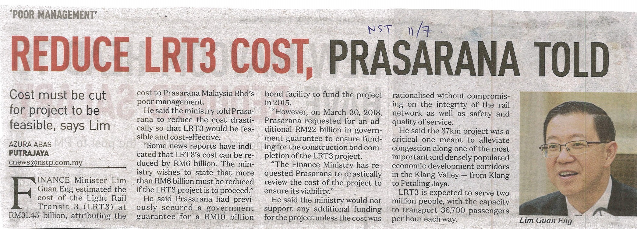 New Strait Times - Reduce LRT3 Cost, Prasarana Told |