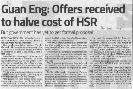 The Star- Guan Eng: Offers Received To Halved Cost Of HSR |
