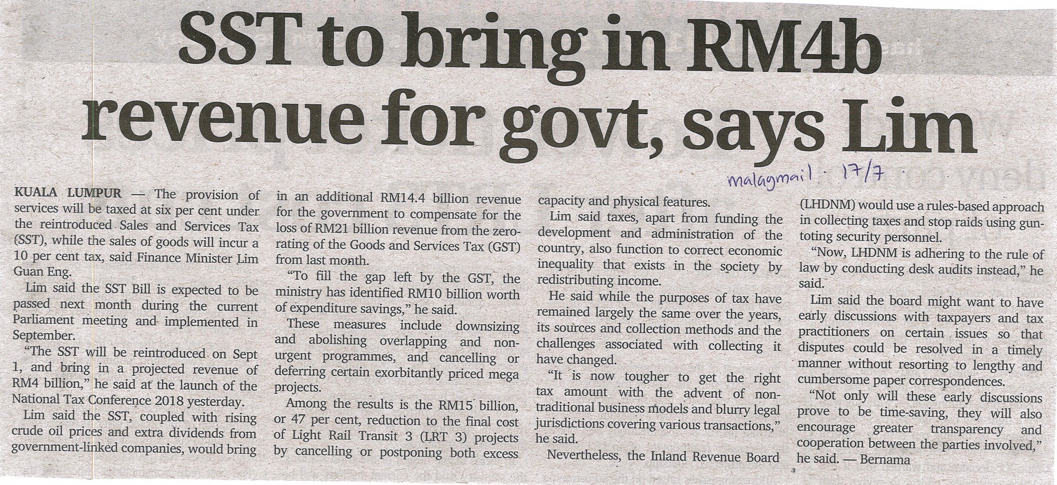 Malay Mail - SST To Bring In RM4b Revenue For Govt, Says Lim |