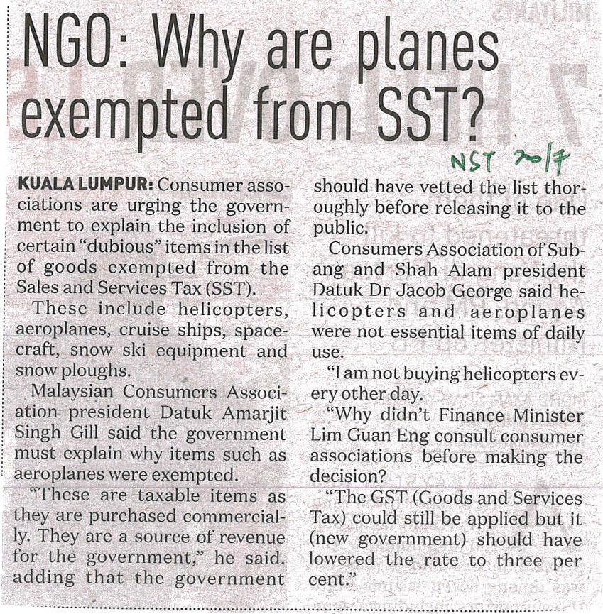 New Straits Times - NGO: Why Are Planes Exempted From SST?
