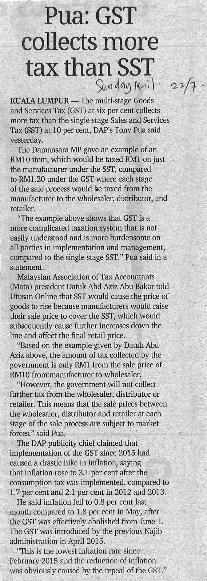 Sunday Mail - Pua: GST Collects More Tax Than SST