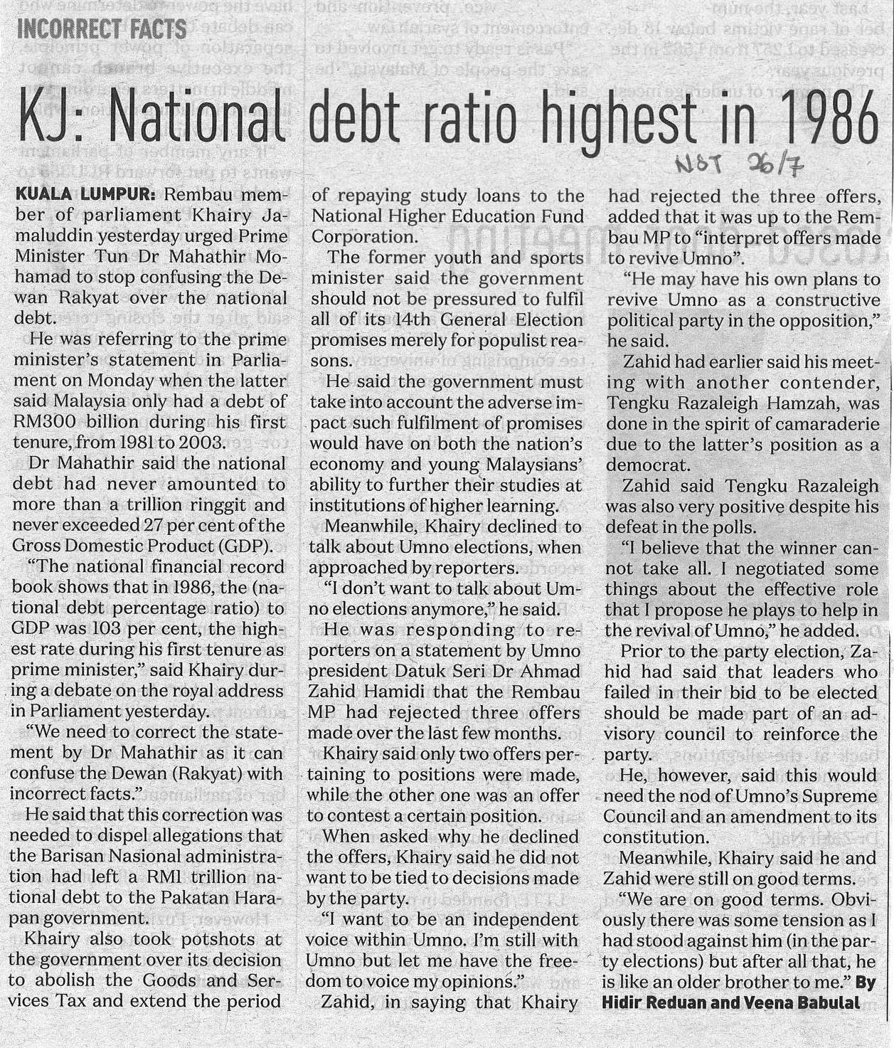 New Straits Times - KJ: National Debt Ratio Highest In 1986