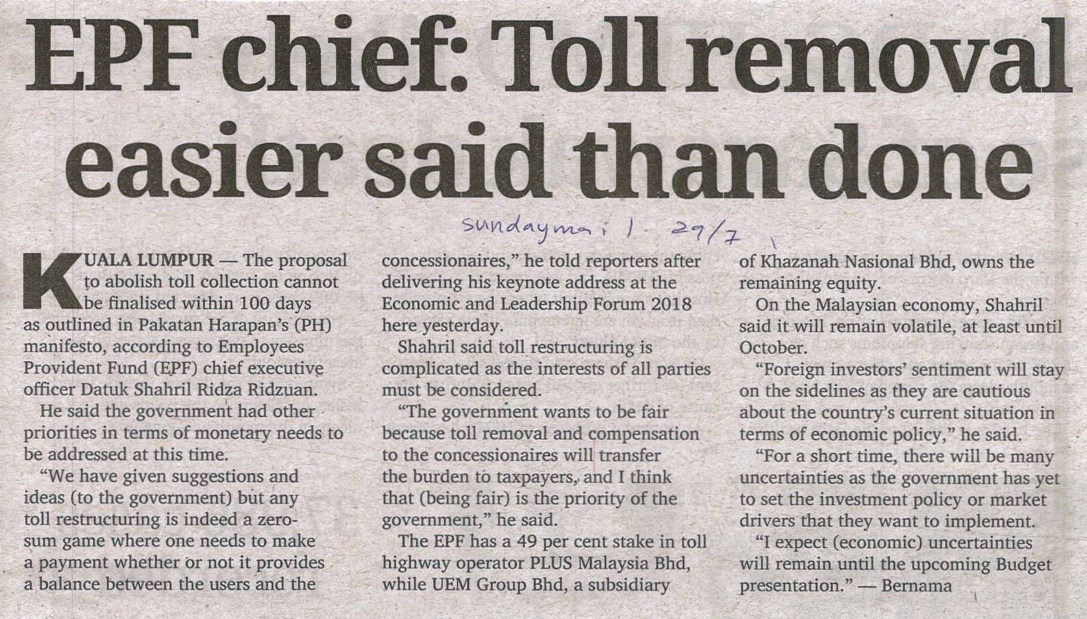 The Sunday Mail - EPF Chief: Toll Removal Easier Said Than Done