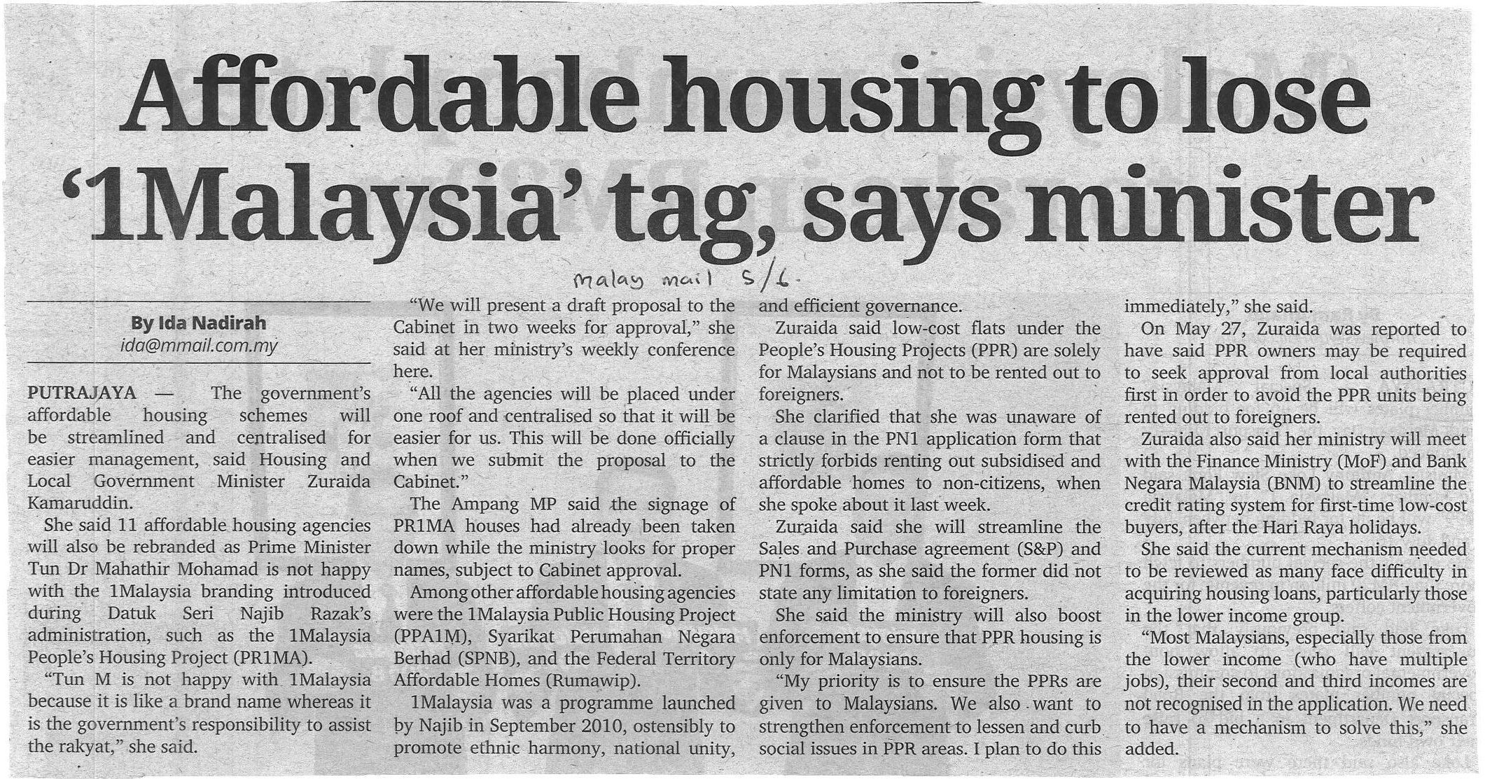 Malay Mail - Affordable Housing To Lose '1Malaysia' tag, Says Minister |