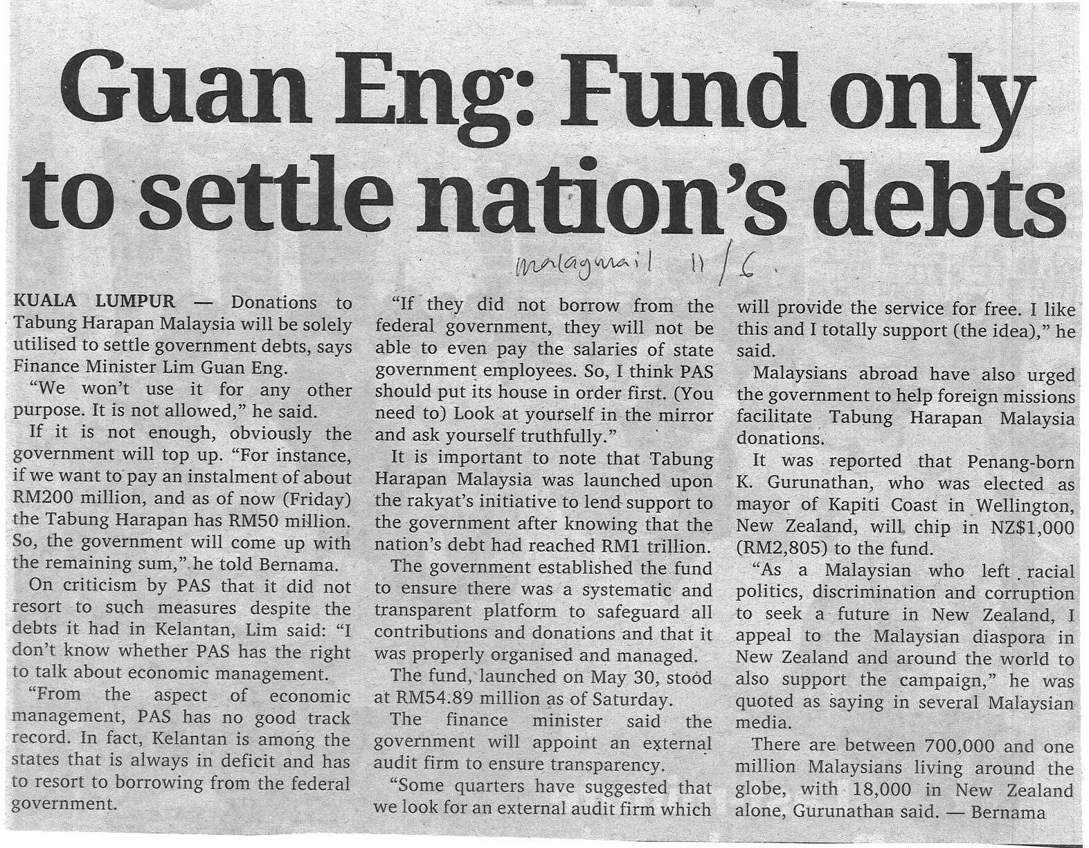 Malay Mail - Guan Eng: Fund Only To Settle Nation's Debts |