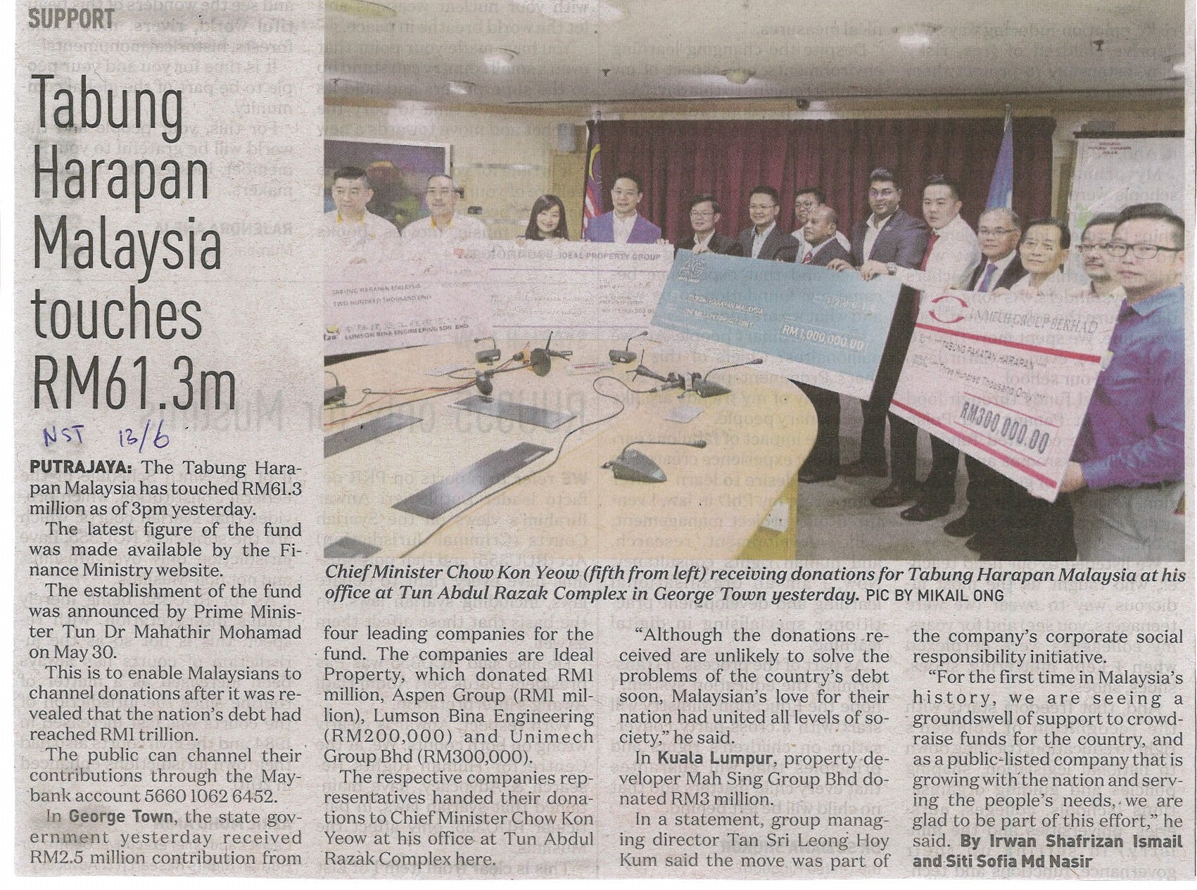 New Strait Times - Spritzer, Yee Lee Corp Donate RM1 Milion To Tabung Harapan |