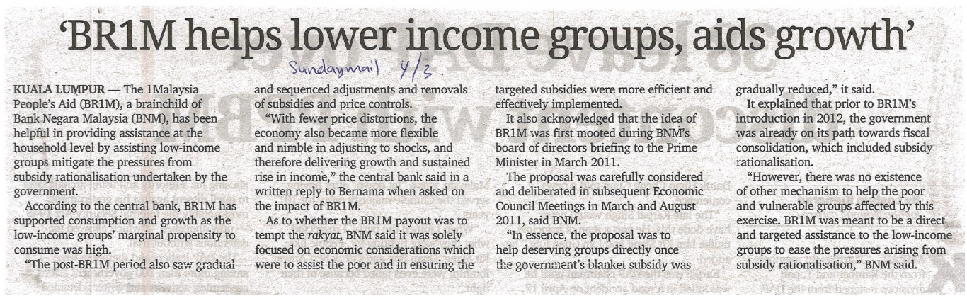 Sunday Mail - BR1M Helps Lower Income Groups, Aids Growth |