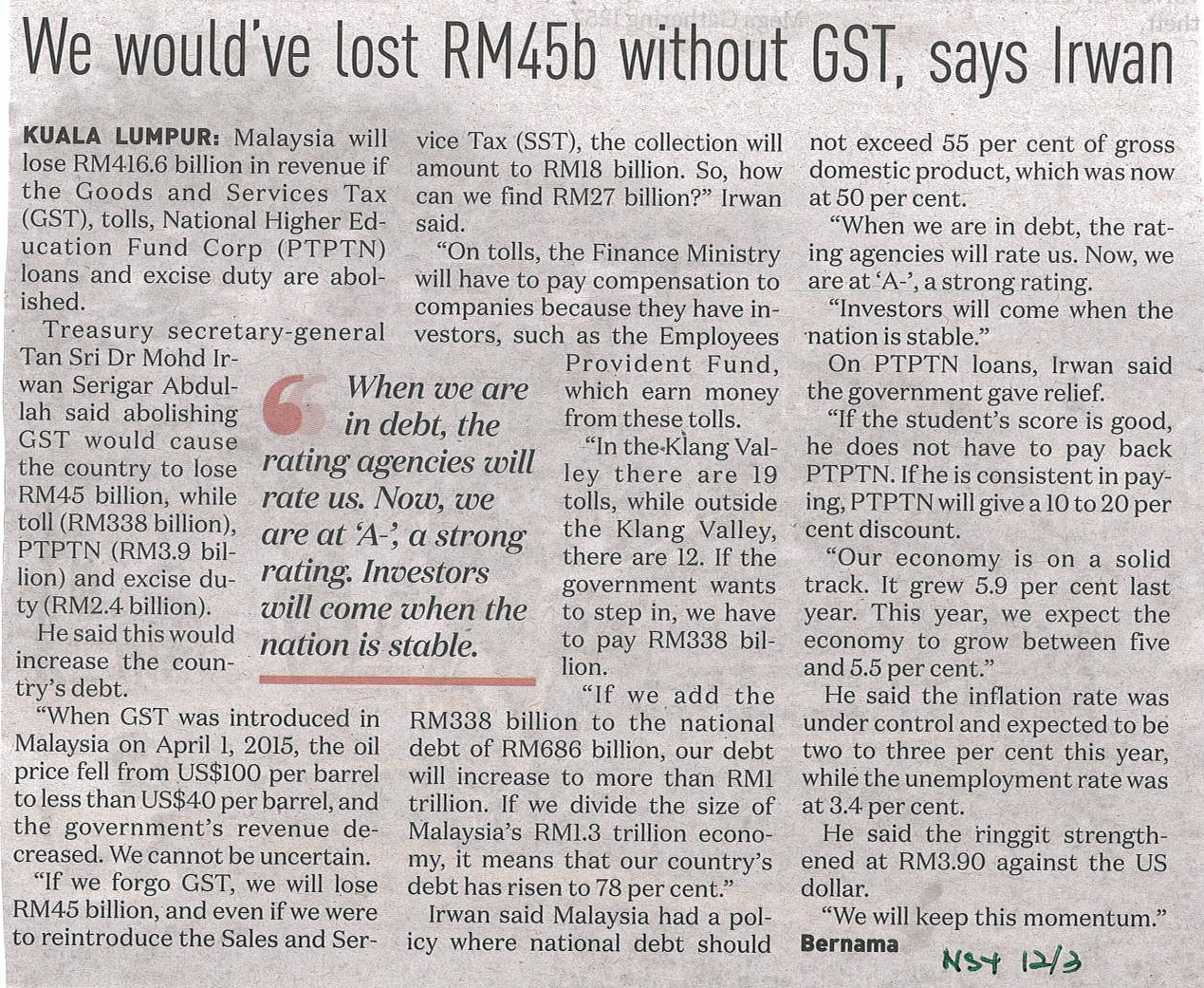 New Strait Times - We Would've Lost RM45b Without GST, Says Irwan |