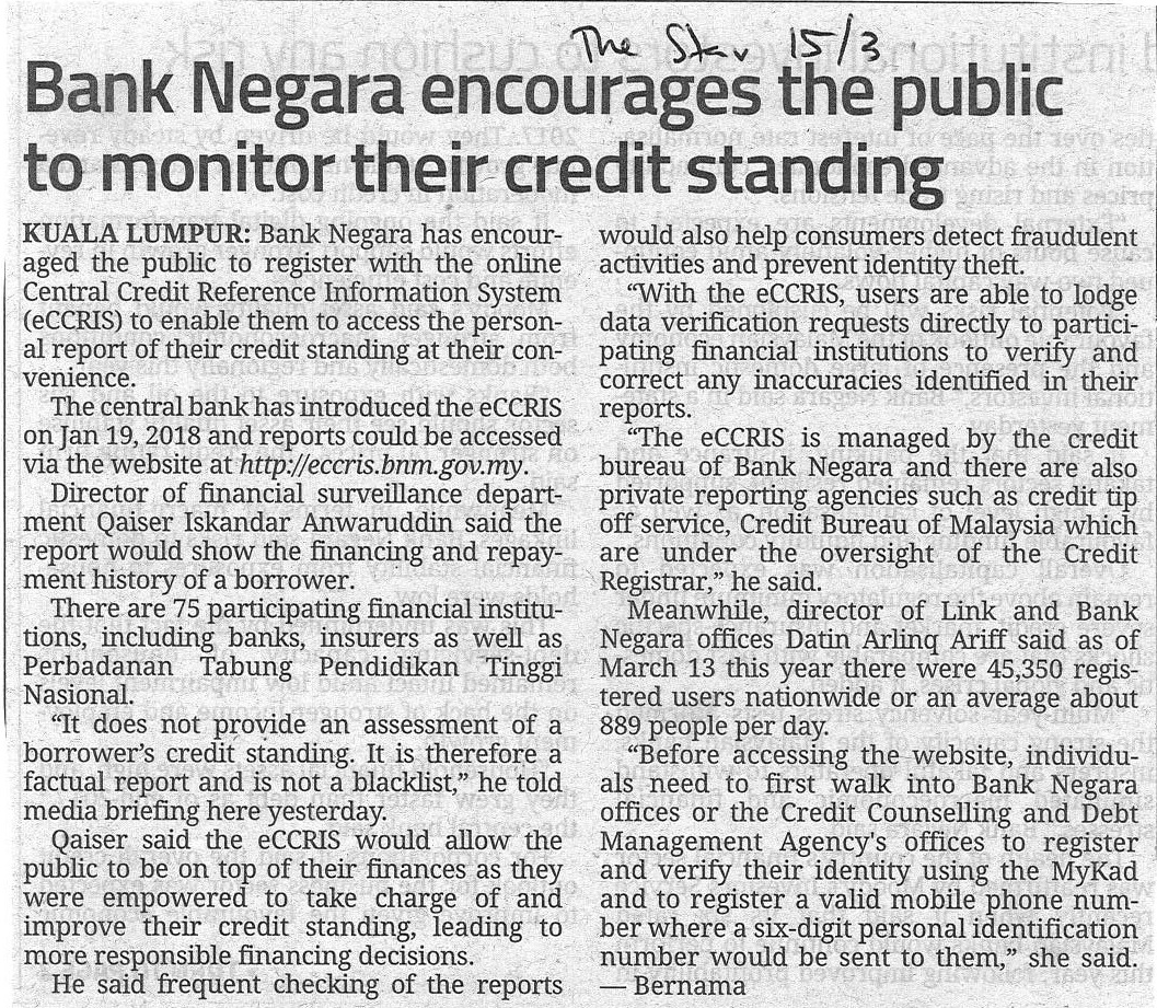 The Star - Bank Negara Encourages The Public To Monitor Their Credit Standing |