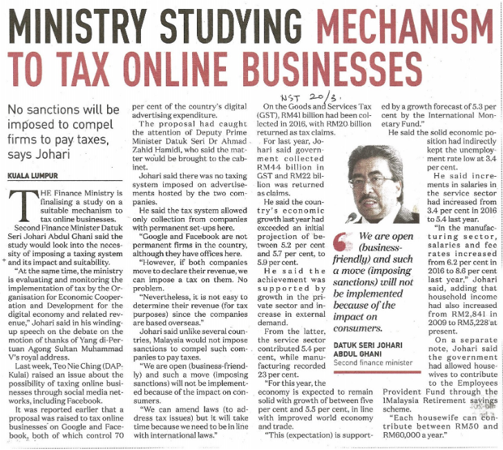 New Straits Times - Ministry Studying Mechanism To Tax Online Businesses |
