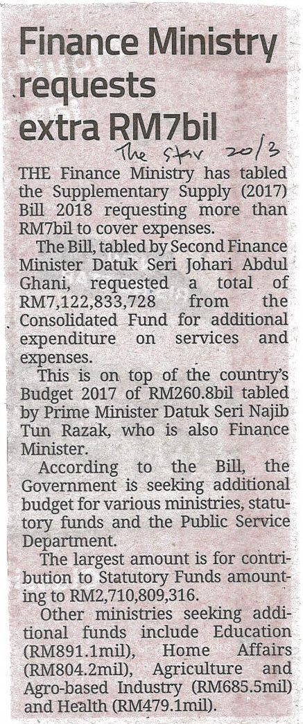 The Star - Finance Ministry Requests Extra RM7Bil |