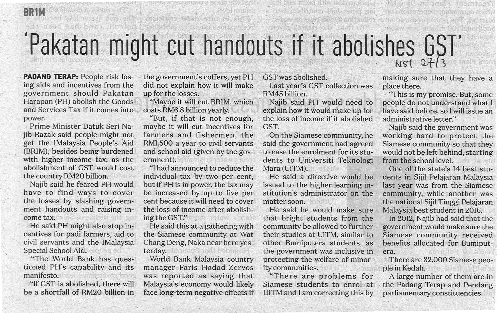 New Strait Times - Pakatan Might Cut Handouts If It Abolishes GST |