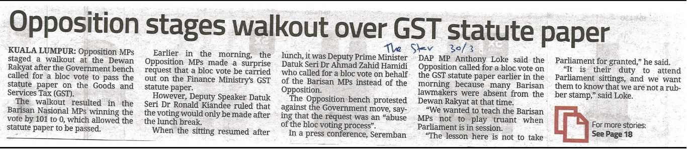 The Star - Opposition Staged Walkout Over GST Statute Paper |