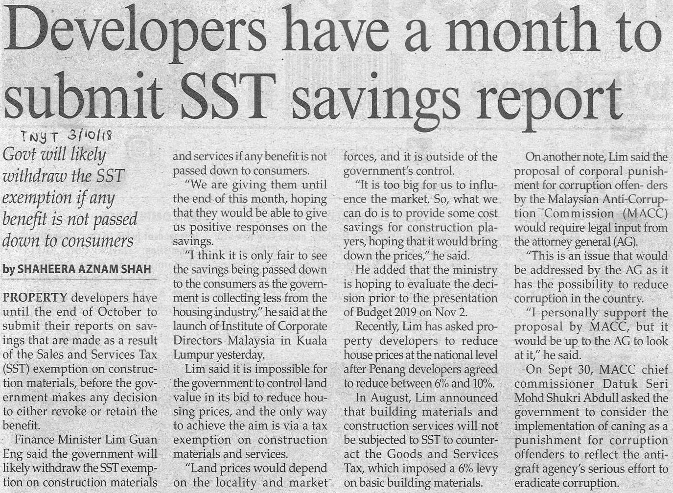 he New Straits Times - Developers Have A Month To Submit SST Savings Report |