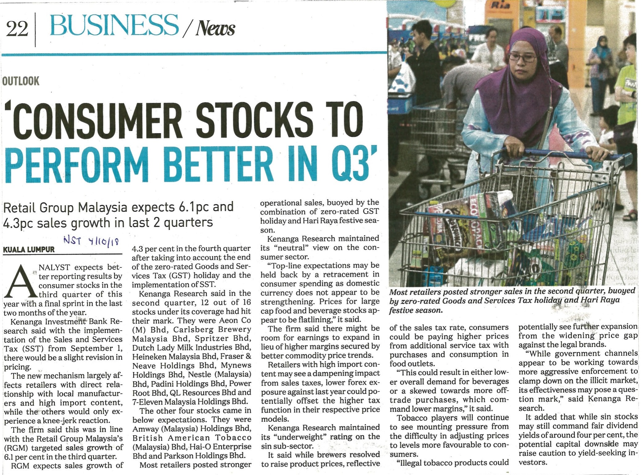 'New Straits Times - Consumer Stocks To Perform Better In Q3' |