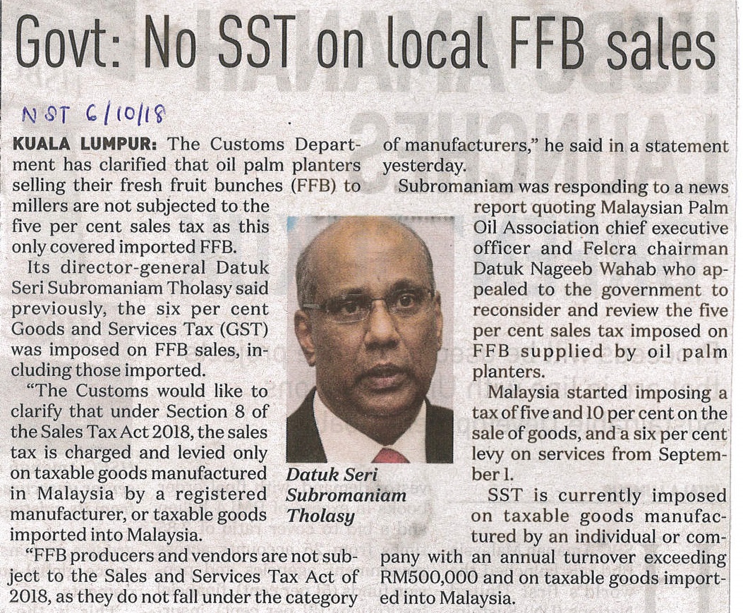 New Straits Times - Govt: No SST On Local FFB Sales |