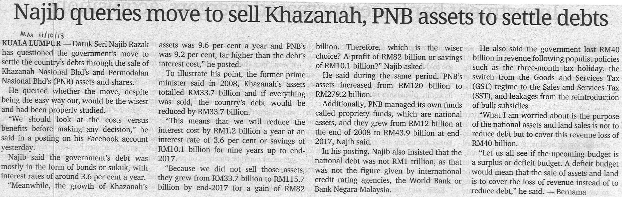 Malay Mail - Najib Queries Move To Sell Khazanah, PNB Assets To Settle Debts |