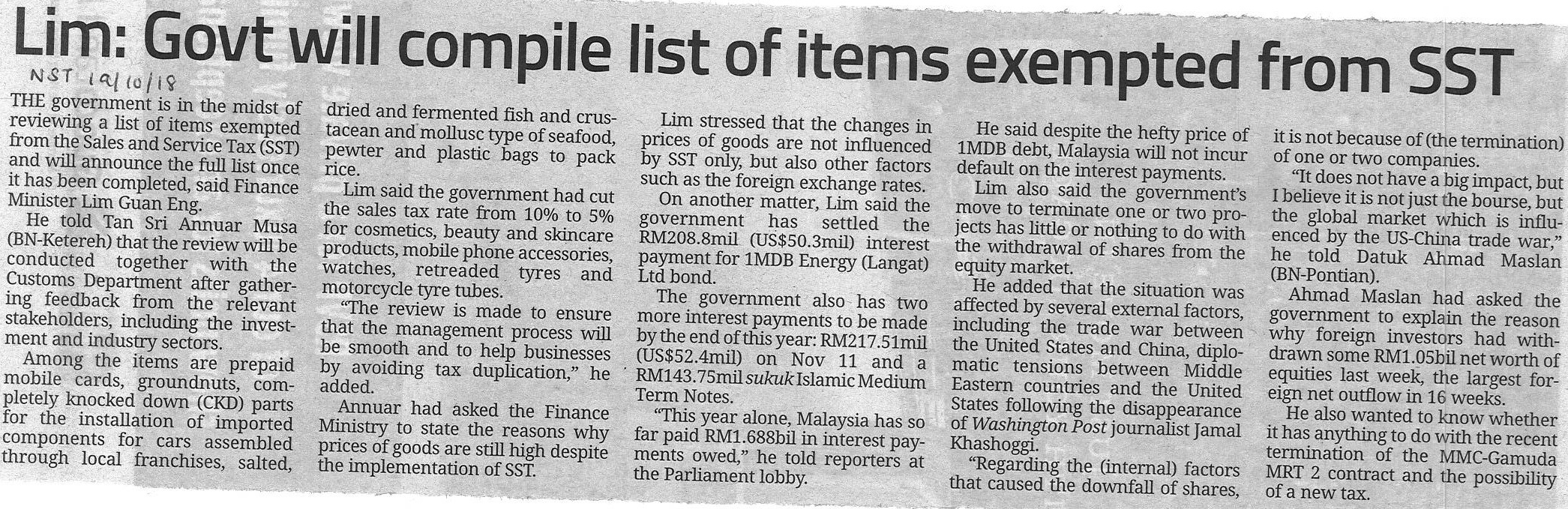 Lim: Govt Will Compile List Of Items Exempted From SST |