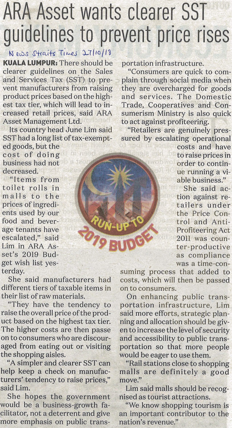 News Straits Times - ARA Asset Wants Clearer SST Guidelines To Prevent Price Rises |