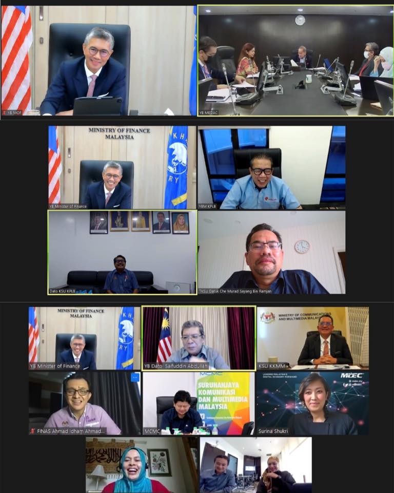 YB Senator Tengku Datuk Seri Utama Zafrul Tengku Abdul Aziz, Menteri Kewangan telah meneruskan sesi libat urus dan perbincangan yang produktif secara maya bersama YB Dato Sri Dr Hj Wan Junaidi Tuanku Jaafar, Menteri Pembangunan Usahawan dan Koperasi (MEDAC), YB Datuk Dr. Abd Latiff Ahmad, Menteri Pembangunan Luar Bandar (KPLB) dan YB Dato’ Saifuddin Abdullah, Menteri Komunikasi dan Multimedia Malaysia (KKMM) bagi mendapatkan input dalam merangka inisiatif-inisiatif di bawah Pelan Pemulihan Negara (PPN).