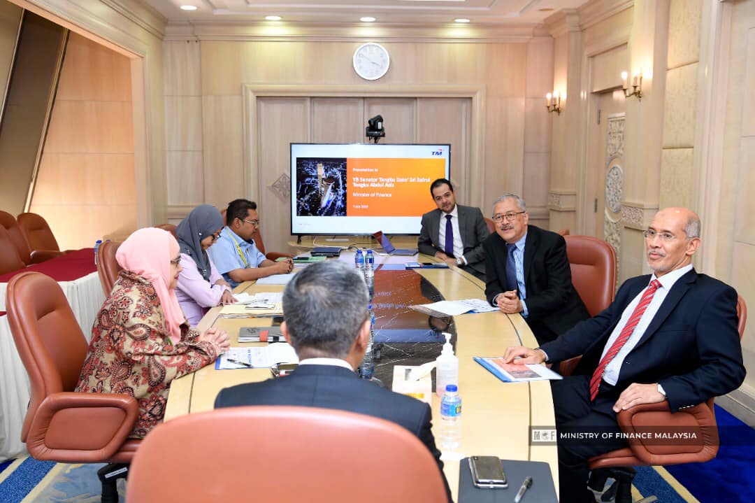 YB Senator Tengku Dato' Sri Zafrul Tengku Abdul Aziz, Menteri Kewangan telah menerima kunjungan hormat daripada delegasi Telekom Malaysia (TM) diketuai oleh Tan Sri Mohd Bakke Salleh, Pengerusi TM, dan Dato’ Noor Kamarul Anuar Nuruddin, CEO TM. Antara perkara yang dibincangkan termasuk sejarah TM dan halatuju masa depan, usaha-usaha merancakkan lanskap digitalisasi negara dalam era IR4.0 dan 5G, serta peranan TM dalam pembangunan negara.