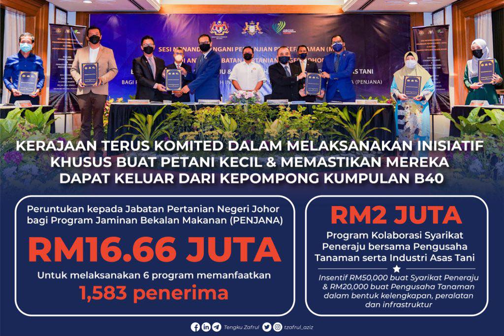 Di bawah Pelan Jana Semula Ekonomi Negara (PENJANA), Kementerian Kewangan (MOF) telah memperuntukkan RM16.66 juta kepada Jabatan Pertanian Negeri Johor bagi pelaksanaan enam program di bawah Program Jaminan Bekalan Makanan untuk memanfaatkan 1,583 penerima.