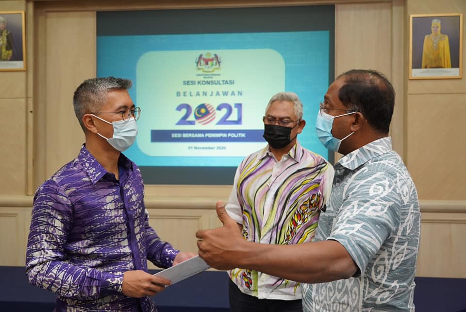 YB Senator Tengku Dato' Sri Zafrul Tengku Abdul Aziz, Menteri Kewangan telah bersama wakil-wakil MKT UMNO, YB Dato’ Seri Ahmad Maslan, SU Agong merangkap Ahli Parlimen Pontian, YB Tan Sri Noh Omar, Ahli MT merangkap Ahli Parlimen Tg Karang, YB Dato’ Seri Dr Zambry Abd Kadir, Ahli MT UMNO merangkap ADUN Pangkor, serta YBhg Dato Dr Asyraf Wajdi Dusuki, Ketua Pergerakan Pemuda UMNO Malaysia, dan Warga MOF telah mengadakan sesi perbincangan #Belanjawan2021. Terima kasih atas lebih 130 cadangan yang disampaikan yang diangkat daripada golongan akar umbi. InsyaAllah, cadangan-cadangan akan dipertimbangan untuk Belanjawan2021 nanti.