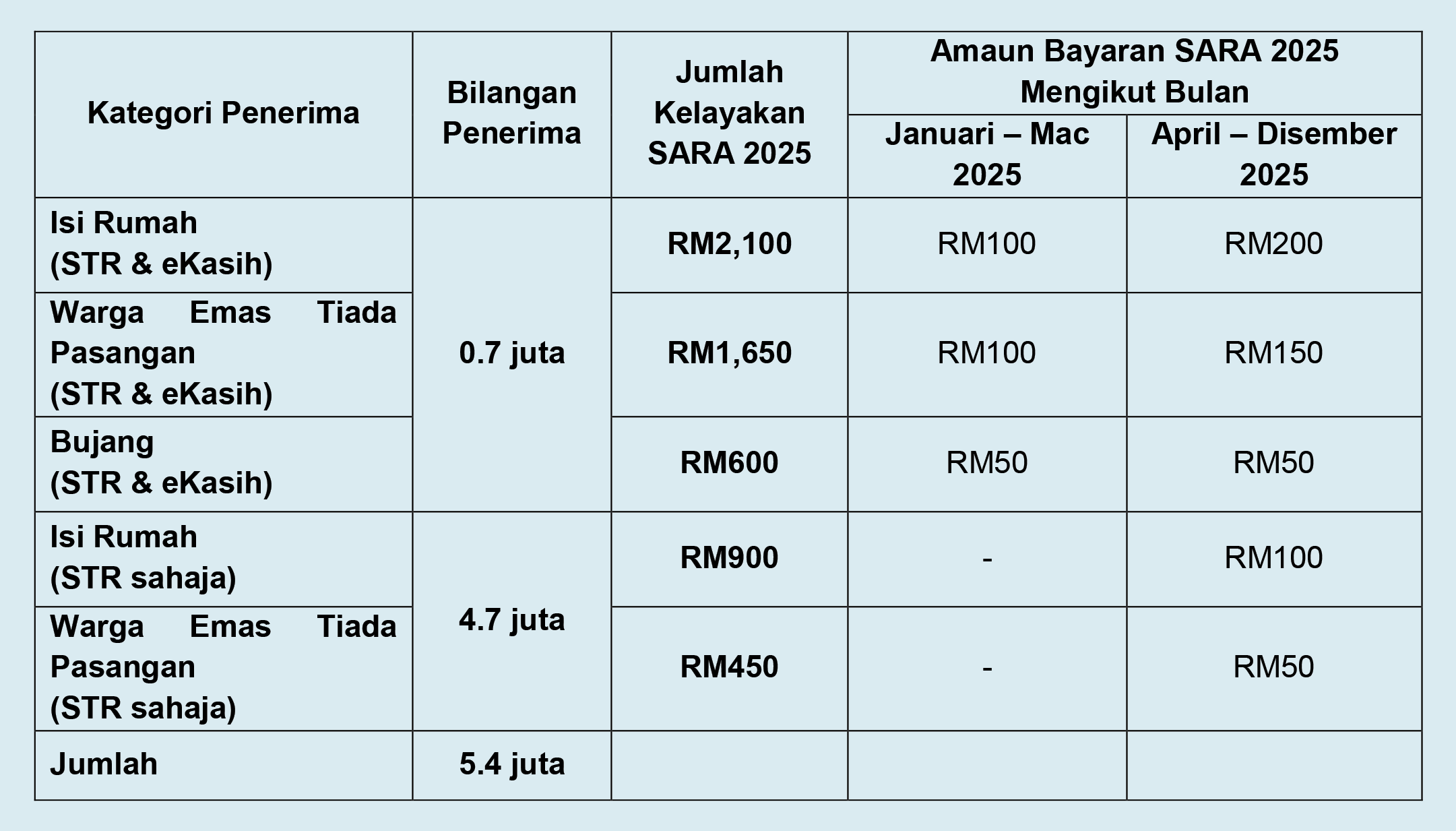 Penerima yang layak akan menerima bantuan SARA sehingga RM2,100 secara keseluruhan pada tahun 2025, berbanding RM1,200 pada tahun 2024 iaitu peningkatan 75% daripada tahun lepas. Bantuan ini akan dikreditkan secara bulanan ke MyKad penerima di seluruh negara, termasuk Sabah, Sarawak dan Wilayah Persekutuan Labuan.