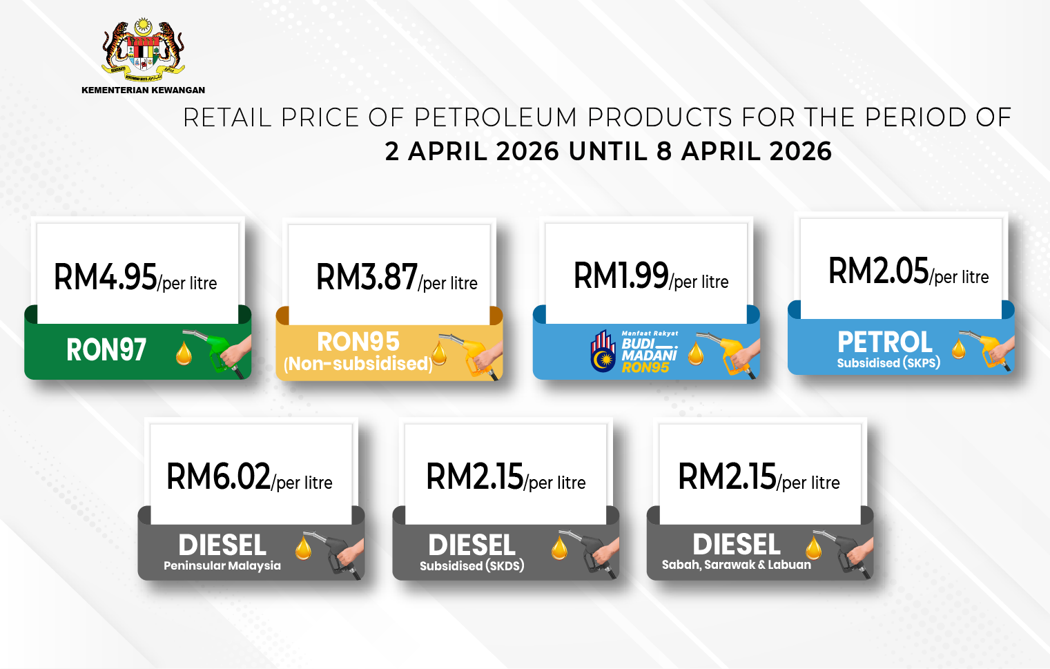 Selaras dengan formula Automatic Pricing Mechanism (APM), harga runcit petrol dan diesel bagi tempoh 2 April hingga 8 April 2026 adalah seperti berikut: