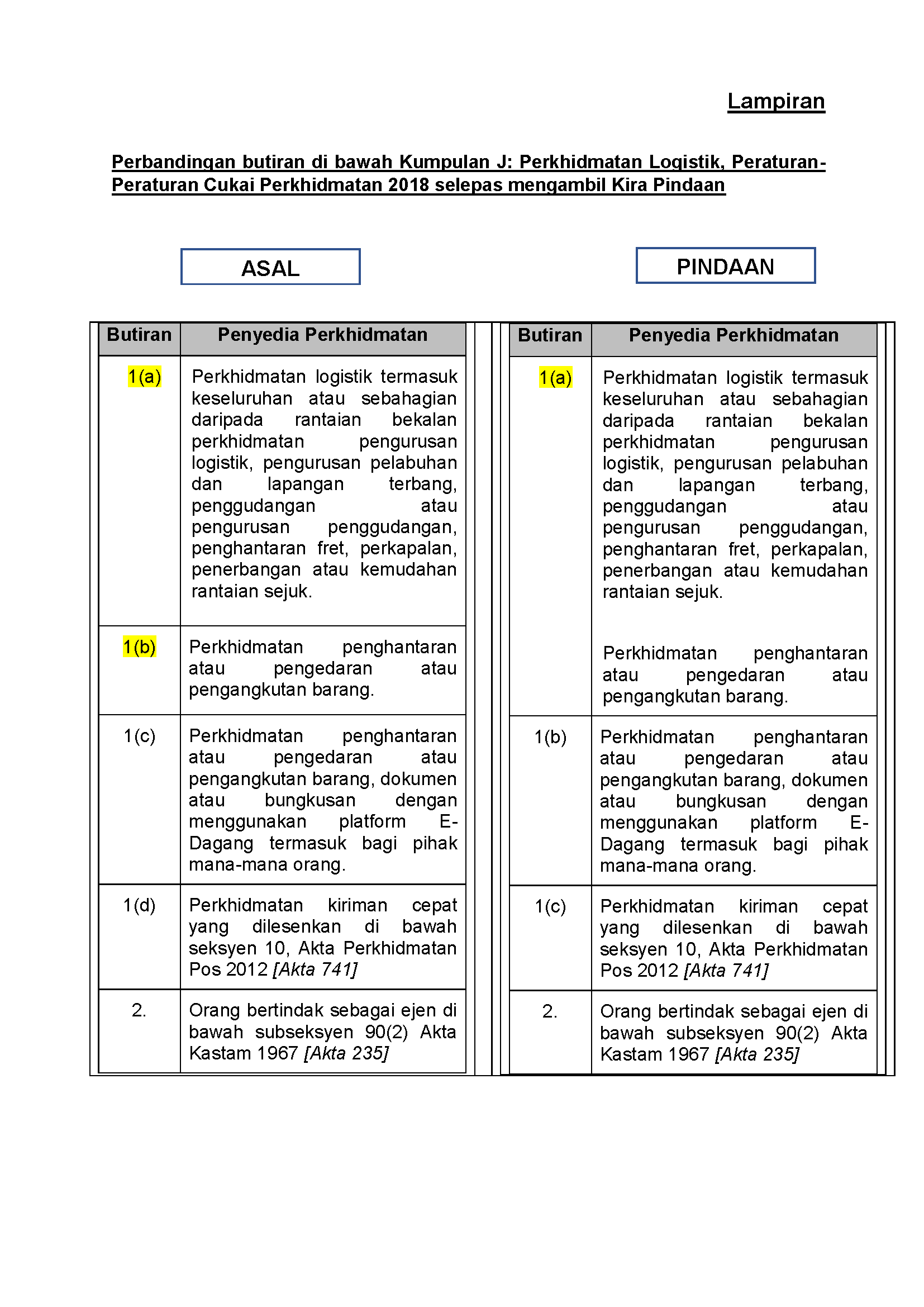 - Pindaan dibuat kepada Kumpulan J: Perkhidmatan Logistik dalam Jadual Pertama, Peraturan-Peraturan Cukai Perkhidmatan 2018 iaitu Butiran 1(a) berkenaan perkhidmatan logistik dan Butiran 1(b) berkenaan perkhidmatan penghantaran atau pengedaran atau pengangkutan barang digabungkan sebagai satu butiran.