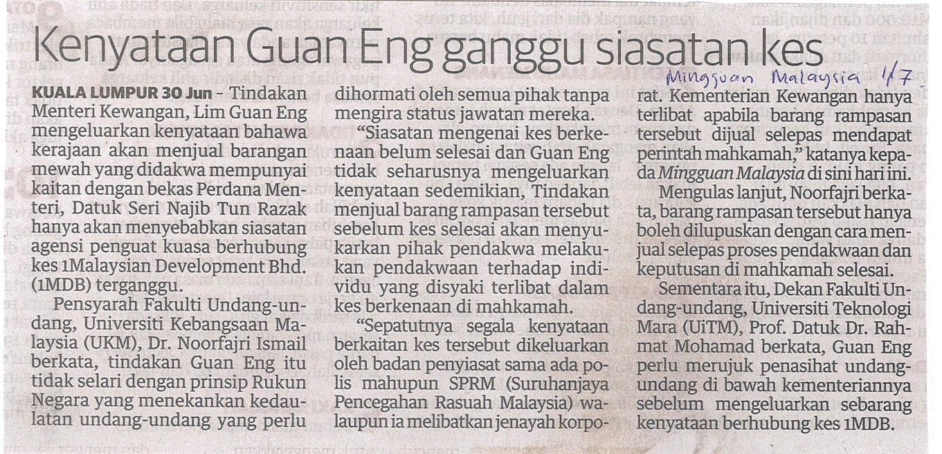 Mingguan Malaysia - Kenyataan Guan Eng Ganggu Siasatan Kes |