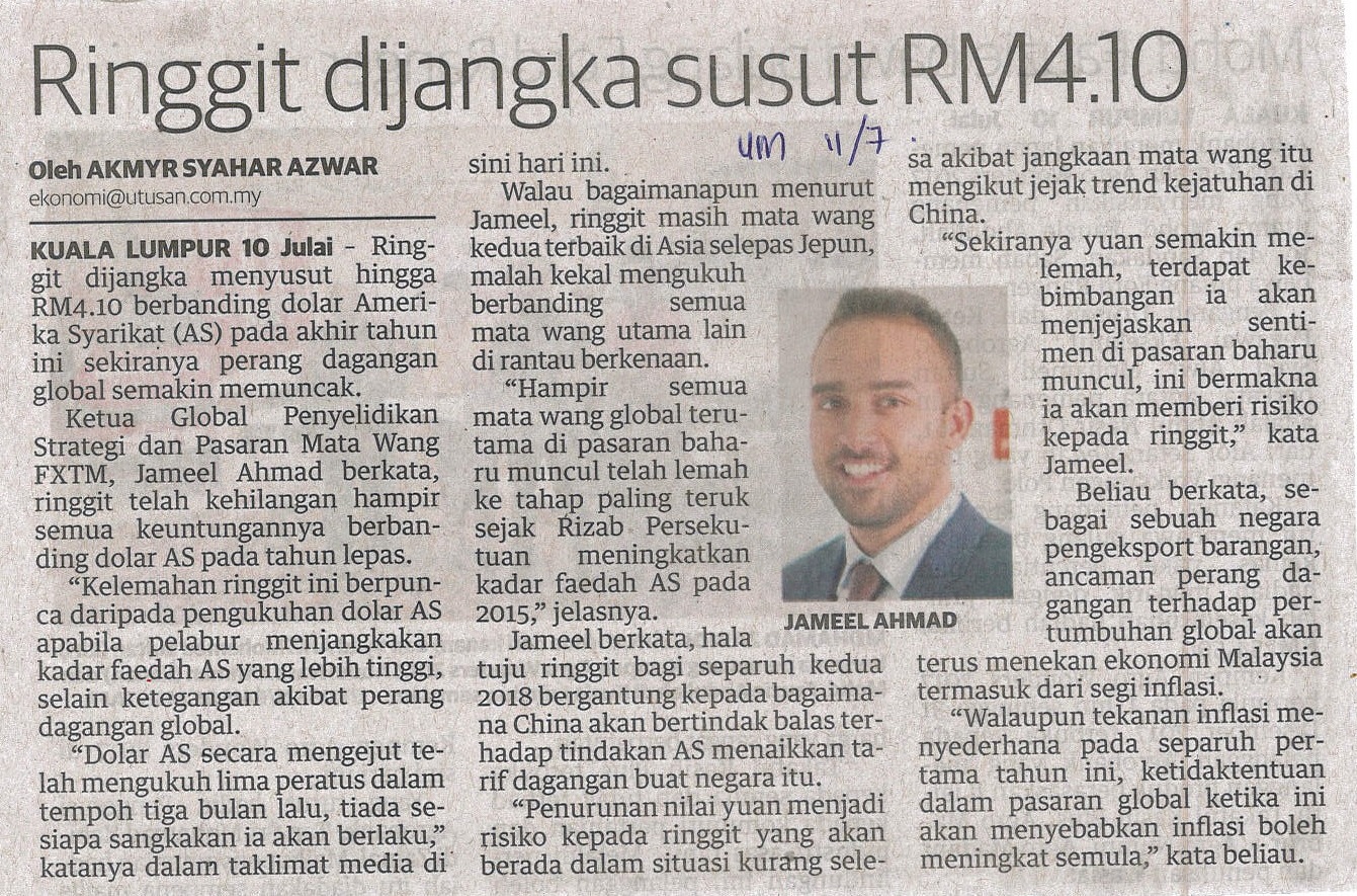 Utusan Malaysia - Ringgit Dijangka Susut RM4.10 |