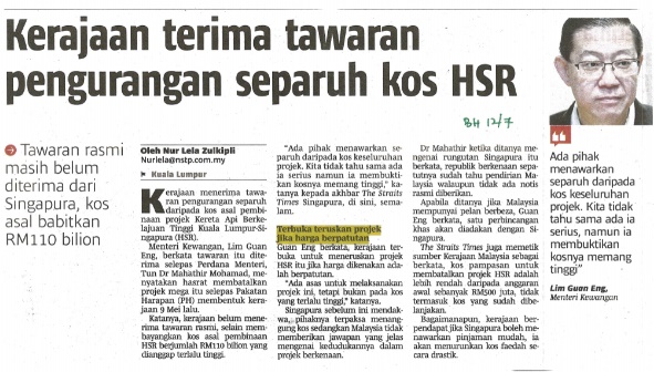 Berita Harian - Kerajaan Terima Tawaran Pengurangan Separuh Kos HSR |