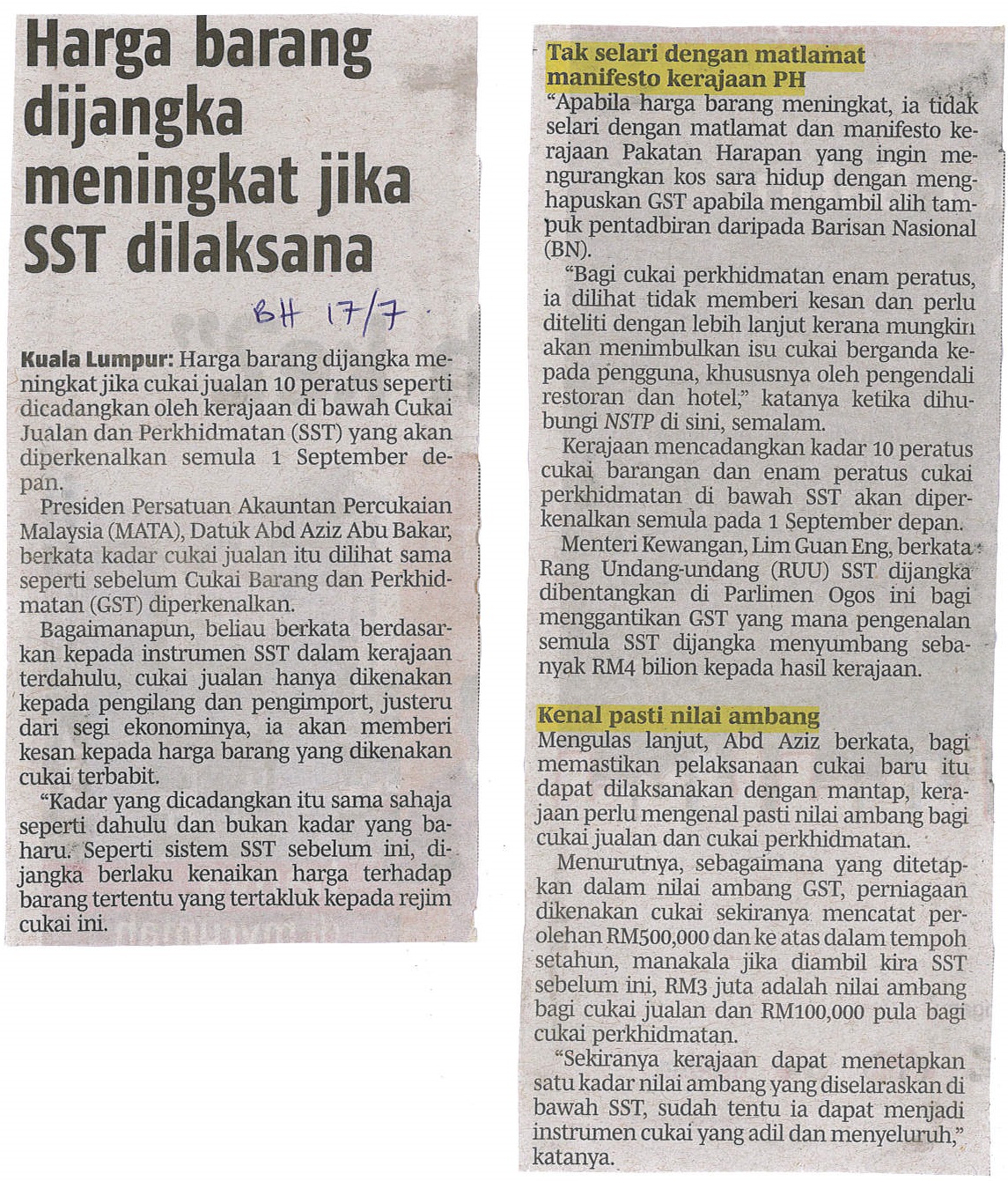 Berita Harian - Harga Barang Dijangka Meningkat Jika SST Dilaksana |