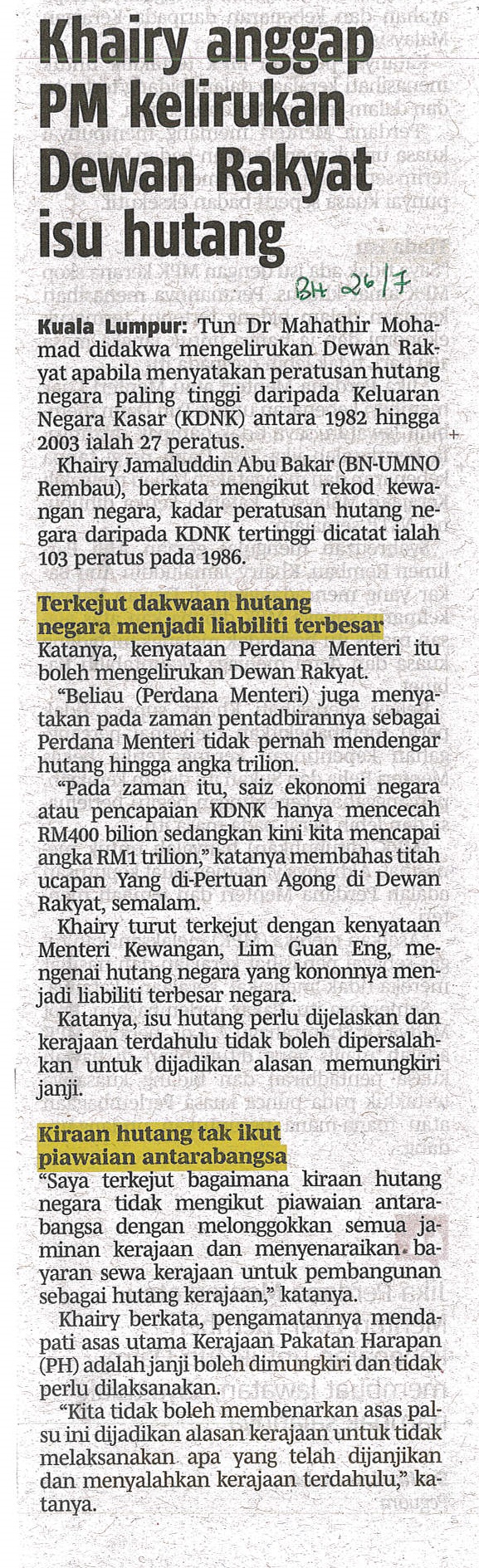 Berita Harian - Khairy Anggap PM Kelirukan Dewan Rakyat Isu Hutang