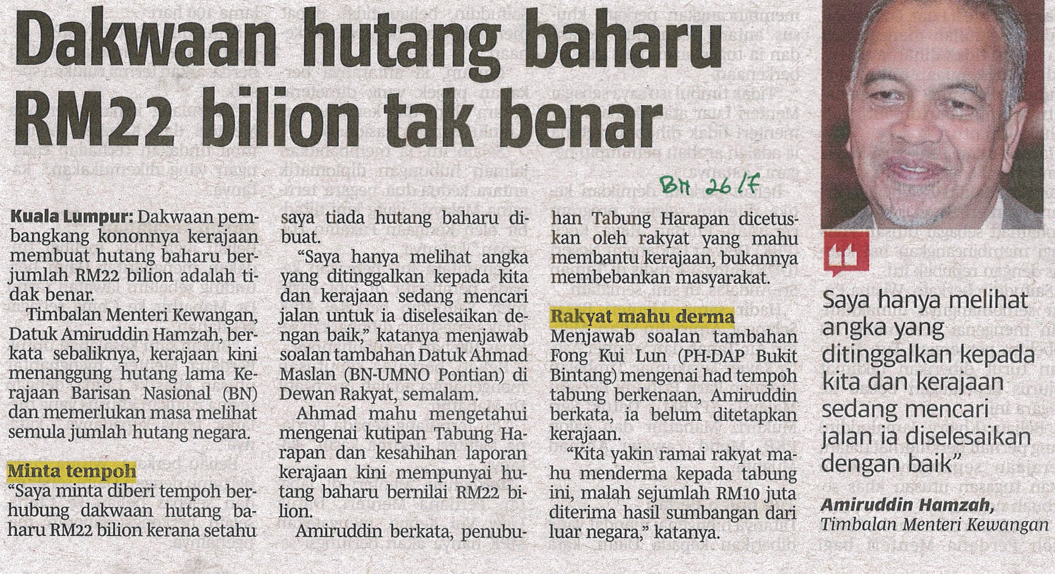Berita Harian - Dakwaan Hutang Baharu RM22 Bilion Tak Benar
